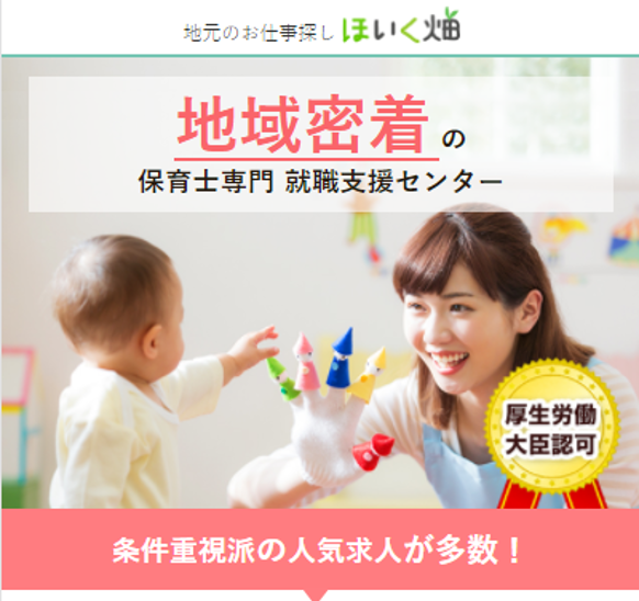 ほいく畑は厚生労働大臣許可の保育士転職センターです。そんな国から認められているコーディネーターがあなたにあった転職先を丁寧に紹介してくれるので、 初めての方や悩みがある方には大変おすすめです!